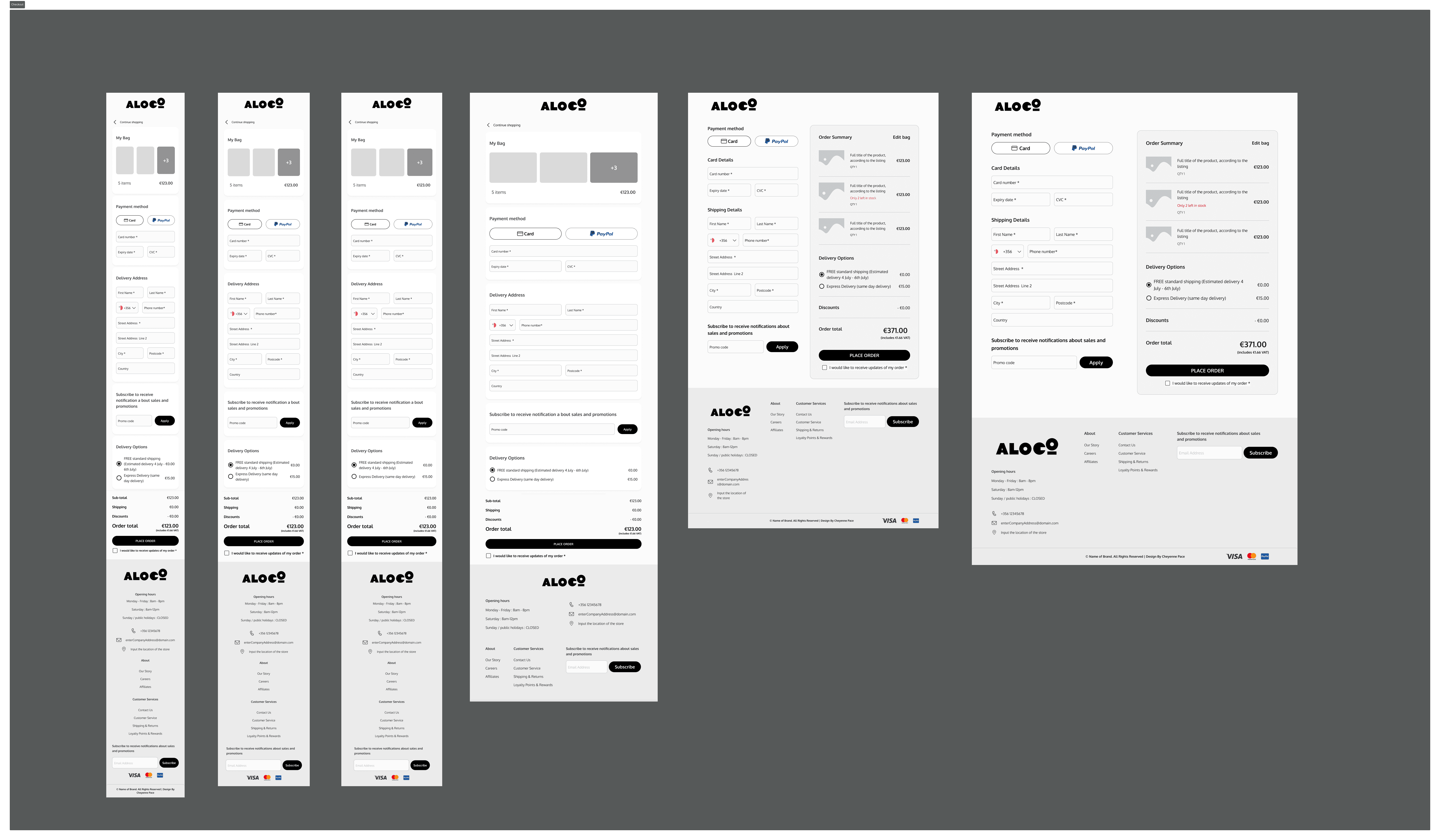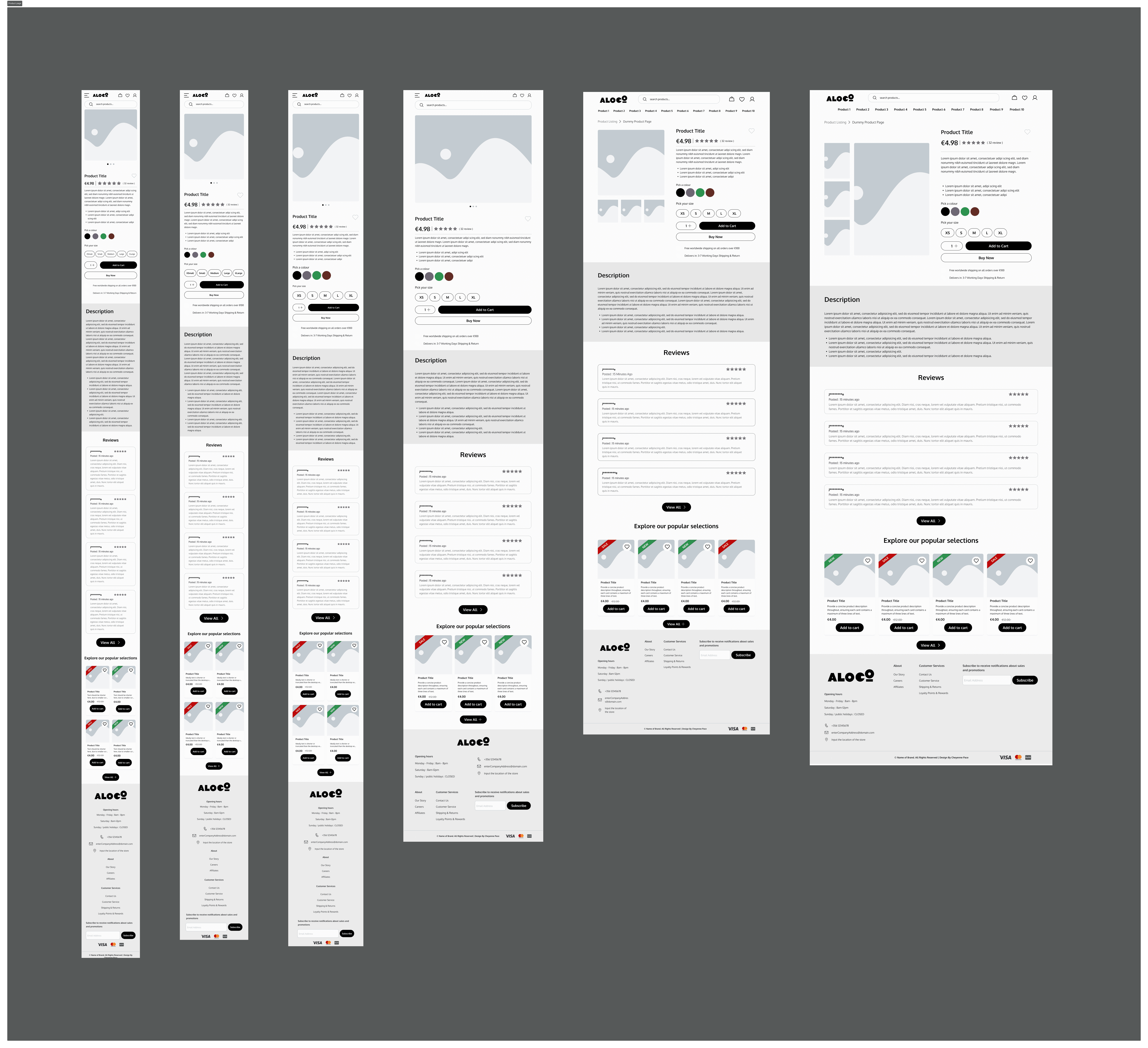 Below is an inside look at how the pages are structured. The actual template includes every page needed for a fully functional e-commerce website, such as the accounts page, the tracking information page, and the login/register page. All pages were designed based on responses from the second survey. Two of these pages, along with their variations, were tested during the final interview.