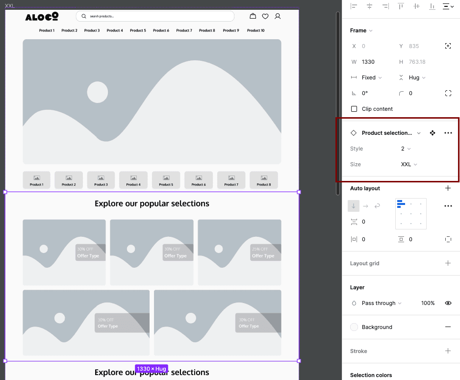 From the panel, one can simply change the variation from the drop down menu. Every variation include the 'Size', which is referring to the breakpoints, whether it is going to be for small mobile device, all the way to big desktops, which is what the current selection is, 'XXL'. The style in this case is between 1 and 2.
