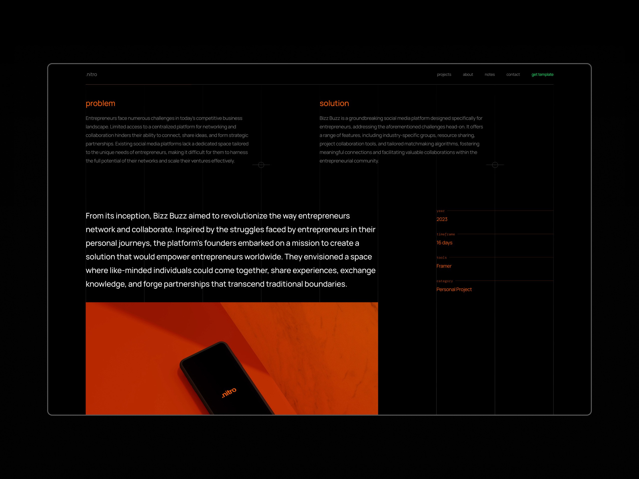 Nitro addresses this challenge by offering a premium Framer template designed for designers. With its advanced layout and attention to detail, Nitro enables designers to create visually stunning websites that capture the attention of visitors. Its success, with over 200 copies sold, highlights its effectiveness in helping designers create standout websites in a competitive market.